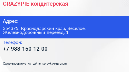 CRAZYPIE, кондитерская по адресу 354375, Краснодарский край, Веселое, Железнодорожный переезд, 1 в дальнейшем Организация, размещена в следующих категориях: