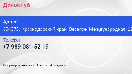 Диноклуб по адресу 354375, Краснодарский край, Веселое, Международная, 12 в дальнейшем Организация, размещена в следующих категориях:
