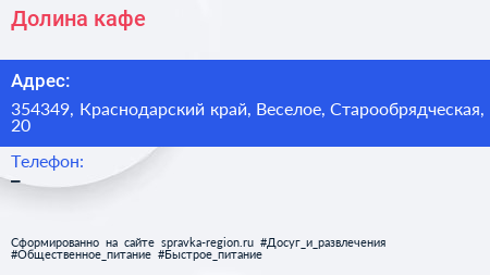 Долина, кафе по адресу 354349, Краснодарский край, Веселое, Старообрядческая, 20 в дальнейшем Организация, размещена в следующих категориях: