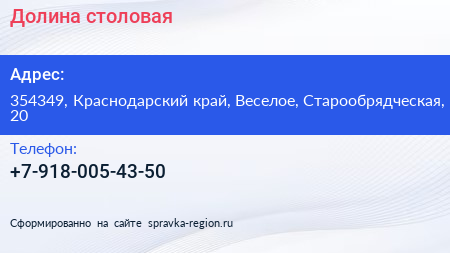 Долина, столовая по адресу 354349, Краснодарский край, Веселое, Старообрядческая, 20 в дальнейшем Организация, размещена в следующих категориях: