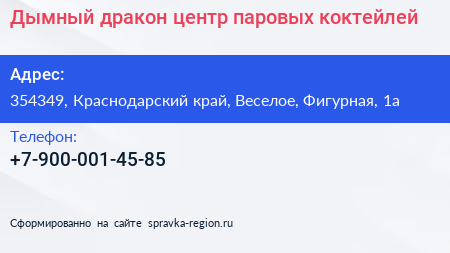 Дымный дракон, центр паровых коктейлей по адресу 354349, Краснодарский край, Веселое, Фигурная, 1а в дальнейшем Организация, размещена в следующих категориях: