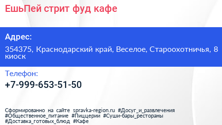 ЕшьПей, стрит-фуд кафе по адресу 354375, Краснодарский край, Веселое, Староохотничья, 8 киоск в дальнейшем Организация, размещена в следующих категориях: