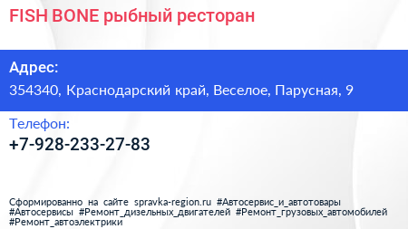 FISH BONE, рыбный ресторан по адресу 354340, Краснодарский край, Веселое, Парусная, 9 в дальнейшем Организация, размещена в следующих категориях: