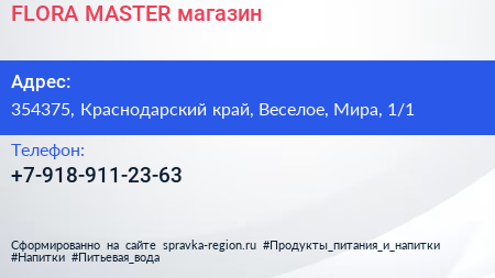 FLORA MASTER, магазин по адресу 354375, Краснодарский край, Веселое, Мира, 1/1 в дальнейшем Организация, размещена в следующих категориях: