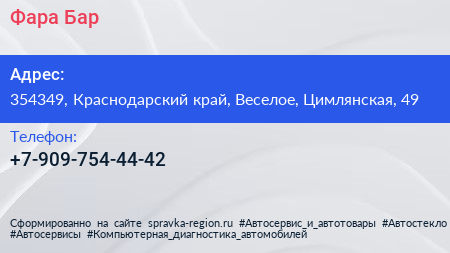 Фара Бар по адресу 354349, Краснодарский край, Веселое, Цимлянская, 49 в дальнейшем Организация, размещена в следующих категориях: