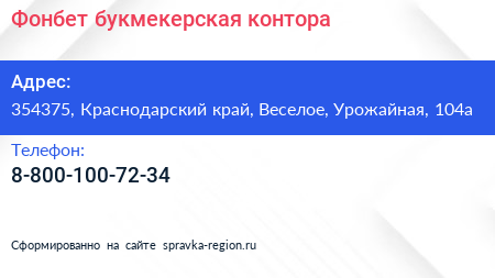 Фонбет, букмекерская контора по адресу 354375, Краснодарский край, Веселое, Урожайная, 104а в дальнейшем Организация, размещена в следующих категориях: