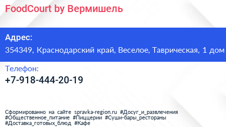 FoodCourt by Вермишель по адресу 354349, Краснодарский край, Веселое, Таврическая, 1 дом в дальнейшем Организация, размещена в следующих категориях: