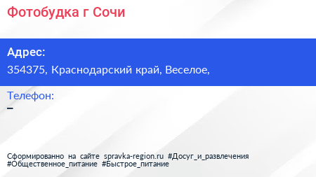 Фотобудка, г. Сочи по адресу 354375, Краснодарский край, Веселое, в дальнейшем Организация, размещена в следующих категориях: