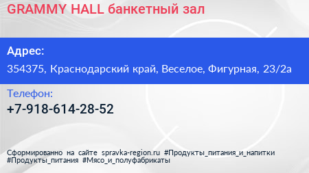 GRAMMY HALL, банкетный зал по адресу 354375, Краснодарский край, Веселое, Фигурная, 23/2а в дальнейшем Организация, размещена в следующих категориях: