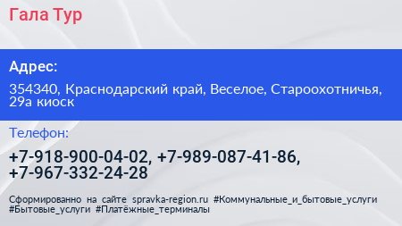 Гала Тур по адресу 354340, Краснодарский край, Веселое, Староохотничья, 29а киоск в дальнейшем Организация, размещена в следующих категориях: