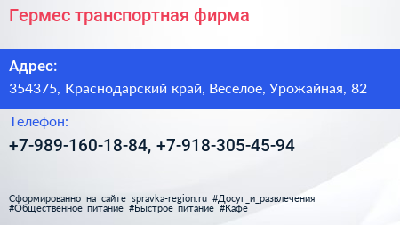 Гермес, транспортная фирма по адресу 354375, Краснодарский край, Веселое, Урожайная, 82 в дальнейшем Организация, размещена в следующих категориях: