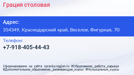 Грация, столовая по адресу 354349, Краснодарский край, Веселое, Фигурная, 70 в дальнейшем Организация, размещена в следующих категориях: