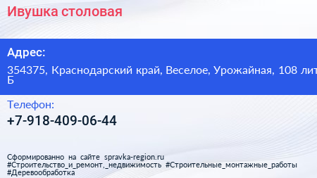 Ивушка, столовая по адресу 354375, Краснодарский край, Веселое, Урожайная, 108 лит Б в дальнейшем Организация, размещена в следующих категориях: