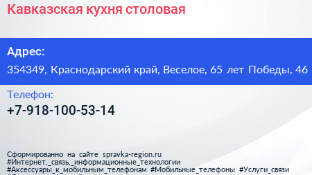 Кавказская кухня, столовая по адресу 354349, Краснодарский край, Веселое, 65 лет Победы, 46 в дальнейшем Организация, размещена в следующих категориях:
