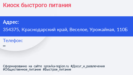 Киоск быстрого питания по адресу 354375, Краснодарский край, Веселое, Урожайная, 110Б в дальнейшем Организация, размещена в следующих категориях: