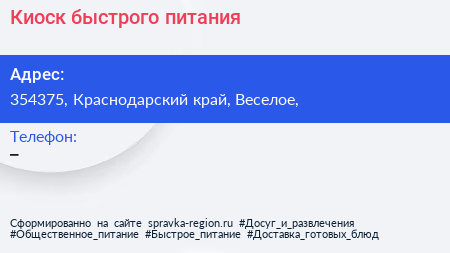 Киоск быстрого питания по адресу 354375, Краснодарский край, Веселое, в дальнейшем Организация, размещена в следующих категориях: