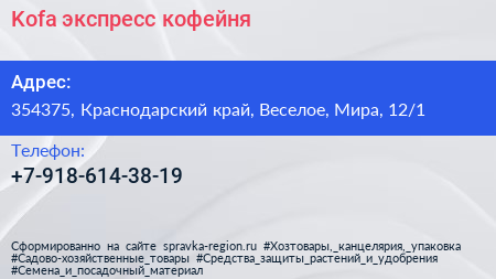 Kofa, экспресс-кофейня по адресу 354375, Краснодарский край, Веселое, Мира, 12/1 в дальнейшем Организация, размещена в следующих категориях: