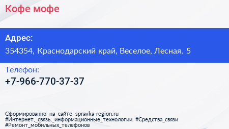 Кофе-мофе по адресу 354354, Краснодарский край, Веселое, Лесная, 5 в дальнейшем Организация, размещена в следующих категориях: