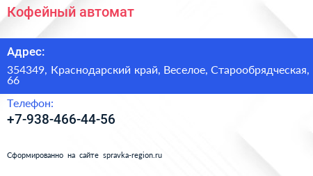 Кофейный автомат по адресу 354349, Краснодарский край, Веселое, Старообрядческая, 66 в дальнейшем Организация, размещена в следующих категориях: