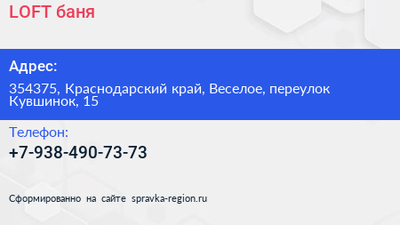 LOFT, баня по адресу 354375, Краснодарский край, Веселое, переулок Кувшинок, 15 в дальнейшем Организация, размещена в следующих категориях: