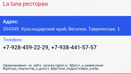 La luna, ресторан по адресу 354349, Краснодарский край, Веселое, Таврическая, 1 в дальнейшем Организация, размещена в следующих категориях: