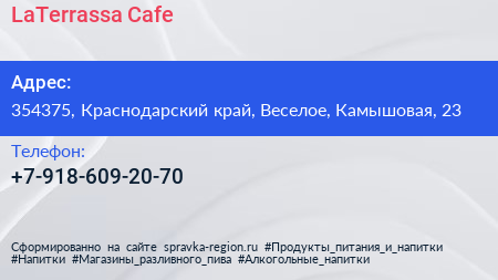 LaTerrassa Cafe по адресу 354375, Краснодарский край, Веселое, Камышовая, 23 в дальнейшем Организация, размещена в следующих категориях: