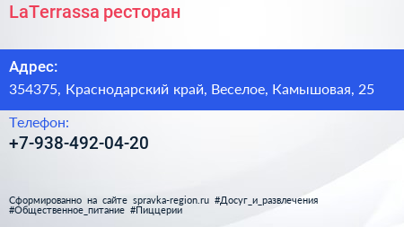 LaTerrassa, ресторан по адресу 354375, Краснодарский край, Веселое, Камышовая, 25 в дальнейшем Организация, размещена в следующих категориях:
