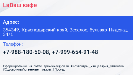 LaВаш, кафе по адресу 354349, Краснодарский край, Веселое, бульвар Надежд, 34/1 в дальнейшем Организация, размещена в следующих категориях:
