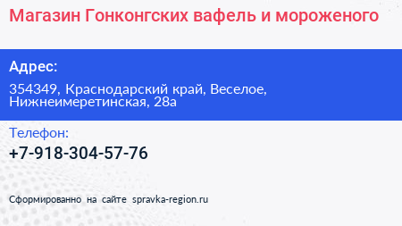 Магазин Гонконгских вафель и мороженого по адресу 354349, Краснодарский край, Веселое, Нижнеимеретинская, 28а в дальнейшем Организация, размещена в следующих категориях: