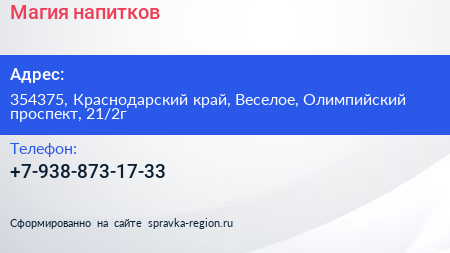 Магия напитков по адресу 354375, Краснодарский край, Веселое, Олимпийский проспект, 21/2г в дальнейшем Организация, размещена в следующих категориях:
