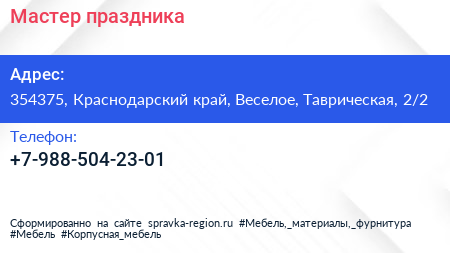 Мастер праздника по адресу 354375, Краснодарский край, Веселое, Таврическая, 2/2 в дальнейшем Организация, размещена в следующих категориях: