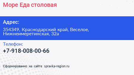 Море & Еда, столовая по адресу 354349, Краснодарский край, Веселое, Нижнеимеретинская, 32а в дальнейшем Организация, размещена в следующих категориях: