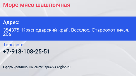 Море мясо, шашлычная по адресу 354375, Краснодарский край, Веселое, Староохотничья, 26а в дальнейшем Организация, размещена в следующих категориях: