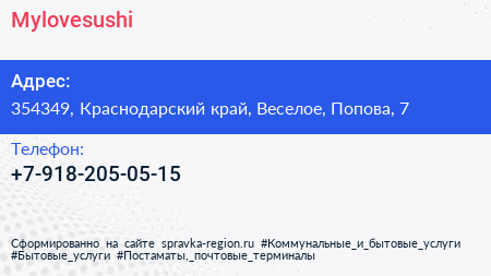 Mylovesushi по адресу 354349, Краснодарский край, Веселое, Попова, 7 в дальнейшем Организация, размещена в следующих категориях: