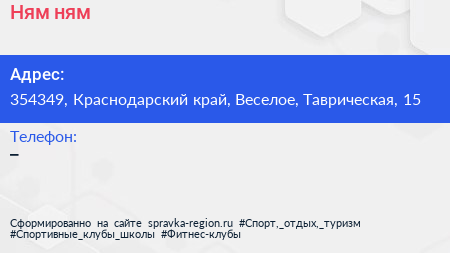 Ням ням по адресу 354349, Краснодарский край, Веселое, Таврическая, 15 в дальнейшем Организация, размещена в следующих категориях: