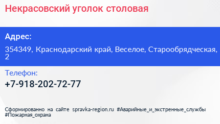 Некрасовский уголок, столовая по адресу 354349, Краснодарский край, Веселое, Старообрядческая, 2 в дальнейшем Организация, размещена в следующих категориях: