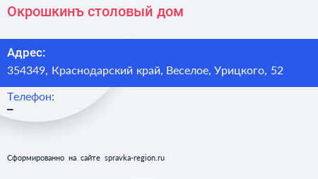 Окрошкинъ, столовый дом по адресу 354349, Краснодарский край, Веселое, Урицкого, 52 в дальнейшем Организация, размещена в следующих категориях: