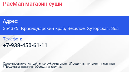 PacMan, магазин суши по адресу 354375, Краснодарский край, Веселое, Хуторская, 36а в дальнейшем Организация, размещена в следующих категориях: