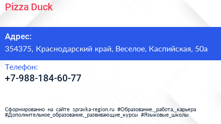 Pizza Duck по адресу 354375, Краснодарский край, Веселое, Каспийская, 50а в дальнейшем Организация, размещена в следующих категориях: