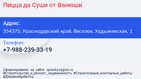 Пицца да Суши от Ванюши по адресу 354375, Краснодарский край, Веселое, Хадыженская, 1 в дальнейшем Организация, размещена в следующих категориях: