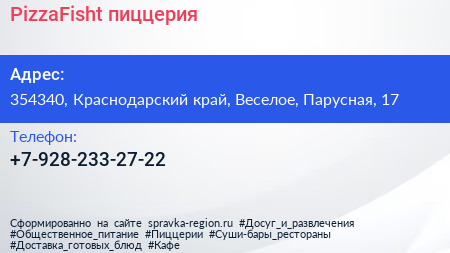PizzaFisht, пиццерия по адресу 354340, Краснодарский край, Веселое, Парусная, 17 в дальнейшем Организация, размещена в следующих категориях: