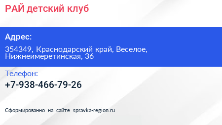 РАЙ, детский клуб по адресу 354349, Краснодарский край, Веселое, Нижнеимеретинская, 36 в дальнейшем Организация, размещена в следующих категориях: