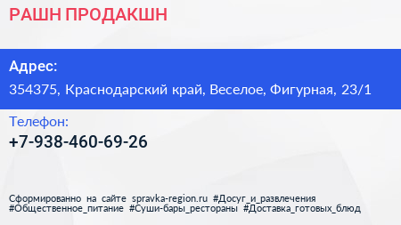 РАШН ПРОДАКШН по адресу 354375, Краснодарский край, Веселое, Фигурная, 23/1 в дальнейшем Организация, размещена в следующих категориях: