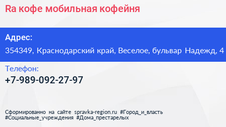 Rа кофе, мобильная кофейня по адресу 354349, Краснодарский край, Веселое, бульвар Надежд, 4 в дальнейшем Организация, размещена в следующих категориях:
