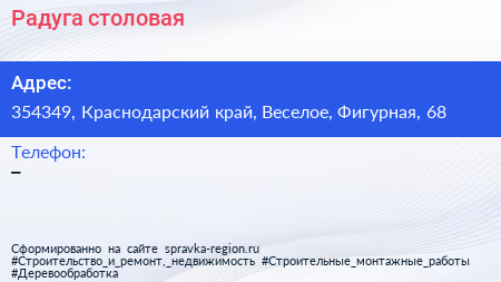Радуга, столовая по адресу 354349, Краснодарский край, Веселое, Фигурная, 68 в дальнейшем Организация, размещена в следующих категориях: