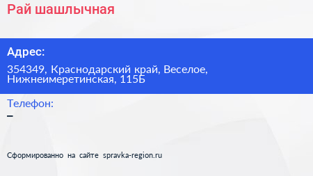 Рай, шашлычная по адресу 354349, Краснодарский край, Веселое, Нижнеимеретинская, 115Б в дальнейшем Организация, размещена в следующих категориях: