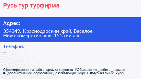 Русь-тур, турфирма по адресу 354349, Краснодарский край, Веселое, Нижнеимеретинская, 151а киоск в дальнейшем Организация, размещена в следующих категориях: