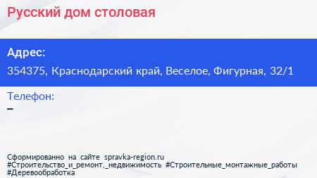 Русский дом, столовая по адресу 354375, Краснодарский край, Веселое, Фигурная, 32/1 в дальнейшем Организация, размещена в следующих категориях: