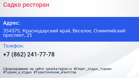 Садко, ресторан по адресу 354375, Краснодарский край, Веселое, Олимпийский проспект, 21 в дальнейшем Организация, размещена в следующих категориях: