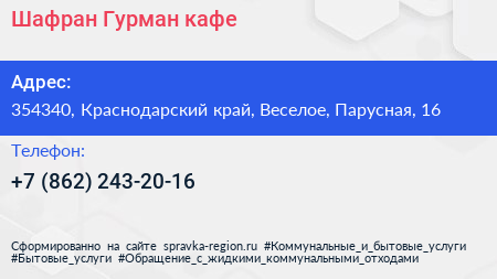 Шафран-Гурман, кафе по адресу 354340, Краснодарский край, Веселое, Парусная, 16 в дальнейшем Организация, размещена в следующих категориях:
